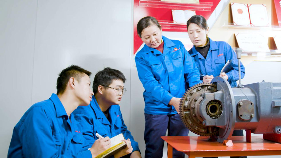 職工們在組裝完畢的新產品前合影留念